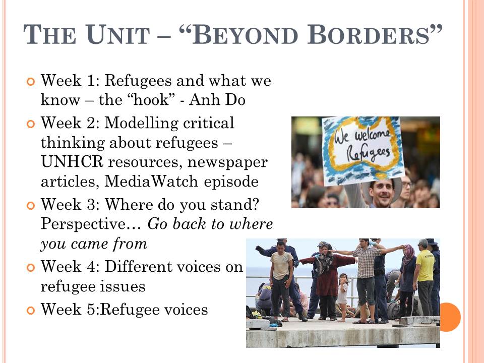 It’s important to note that I found some excellent NSW resources already in existence in the creation of this unit. The NSW DEC Curriculum Coordination and Leadership Team, with teachers from Billabong High School, created an amazing unit called “In Their Position”, with a focus on the refugee experience, which is available through the DEC Intranet. It wasn’t exactly what we needed for our context, but had some great activities, so “Beyond Borders” uses and adapts some ideas and resources from that. Thanks also to Paula Madigan and the team at Coffs Harbour High School, who created a unit called “No Turning Back”. Paula presented this at the ETANSW 2013 Conference in collaboration with Viviana Matiello. Ideas and activities have also been drawn from this unit.
