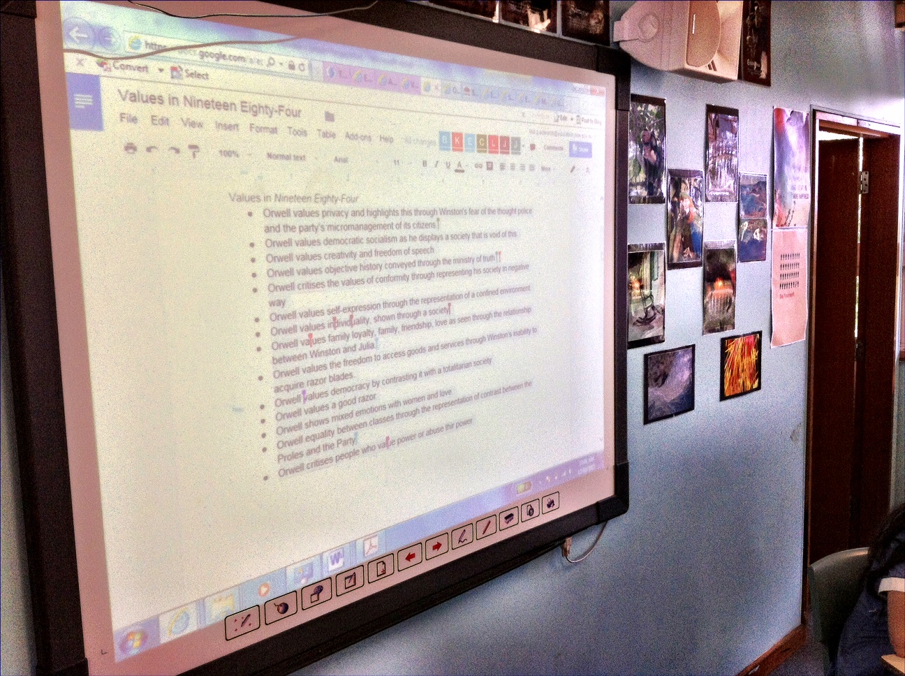 Today, I created and shared a doc with Year 12, who then, from their own devices, brain dumped their ideas about Orwell’s representation of values in Nineteen Eighty-Four into the doc. You can see their little cursors all over it.